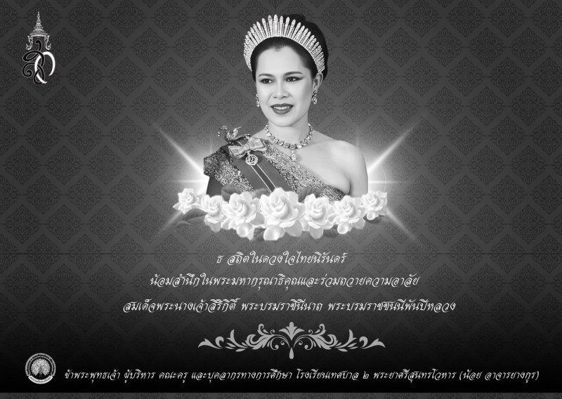 ๒๔ ตุลาคม ๒๕๖๘ ธ สถิตในดวงใจไทยนิรันดร์ น้อมสำนึกในพระมหากรุณาธิคุณและร่วมถวาย ความอาลัย สมเด็จพระนางเจ้าสิริกิติ์ พระบรมราชินีนาถ พระบรมราชชนนีพันปีหลวง ข้าพระพุทธเจ้า ผู้บริหาร คณะครู และบุคลากรทางการศึกษา โรงเรียนเทศบาล ๒ พระยาศรีสุนทรโวหาร (น้อย อาจ